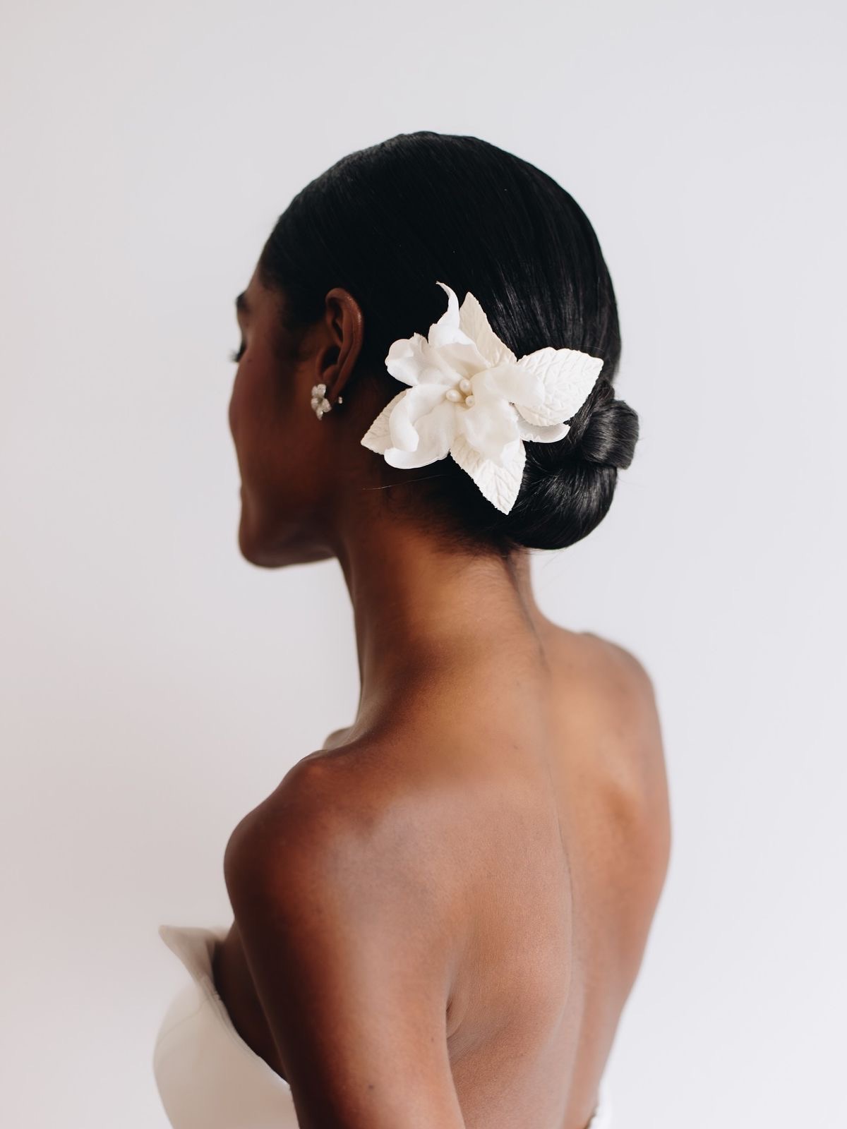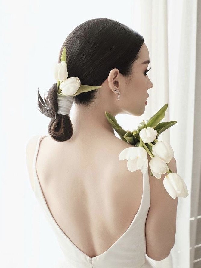 どんな衣裳とも相性がよく、幅広いアレンジができるシニョンだからこそ、自由なコーディネートを楽しんで。