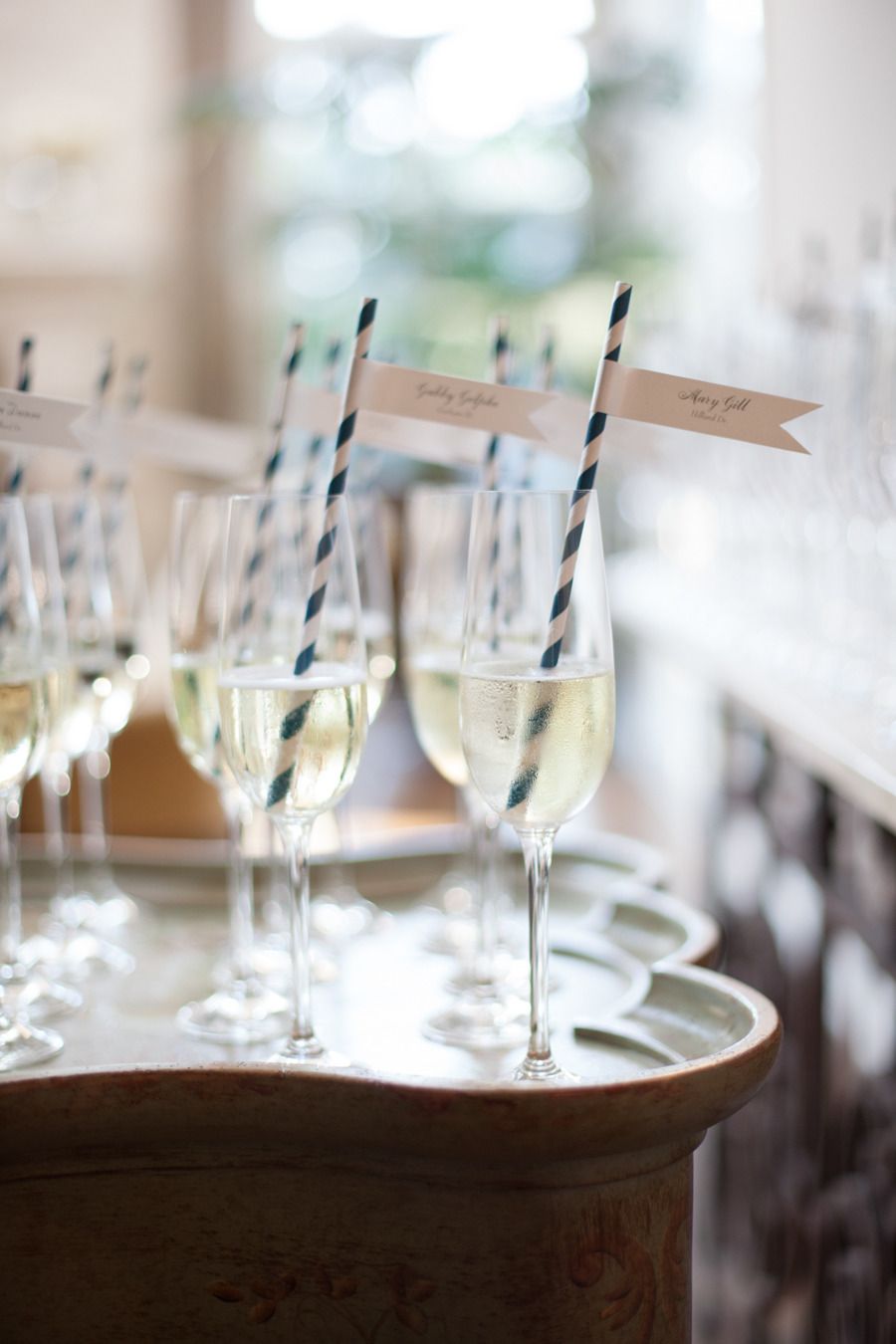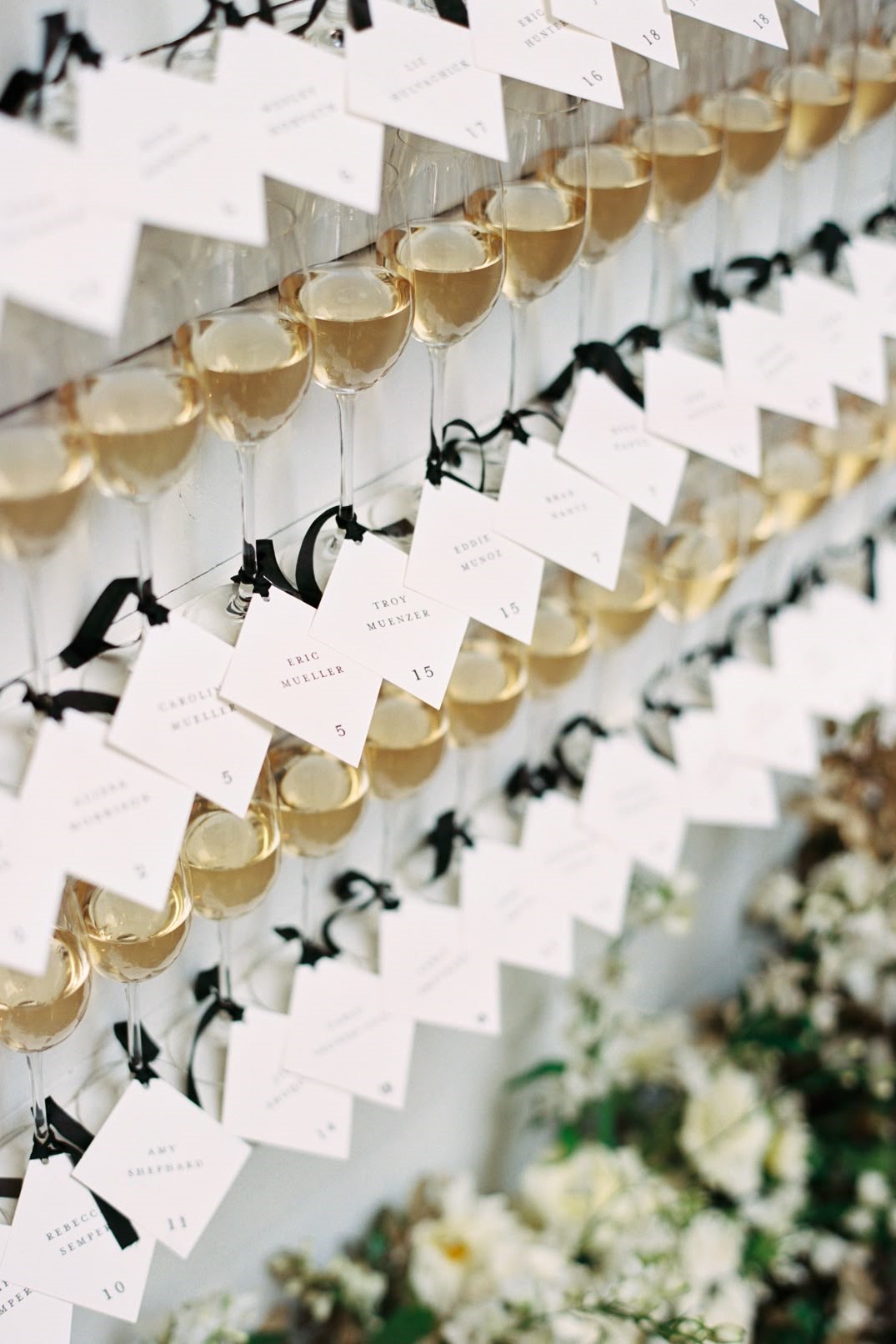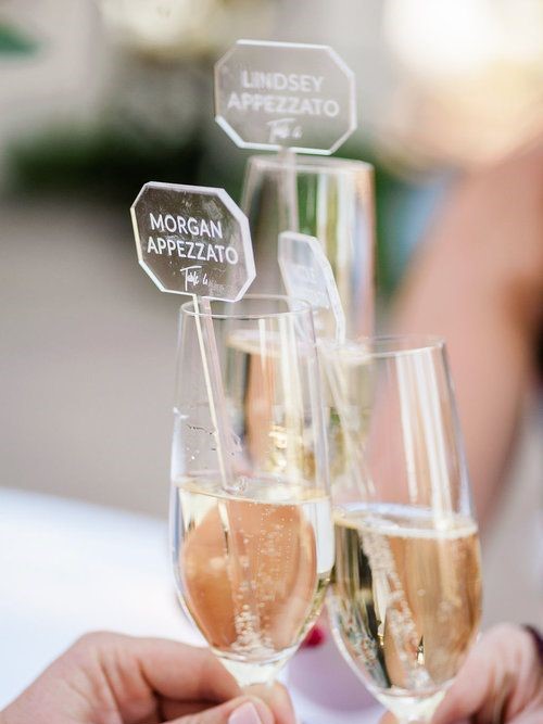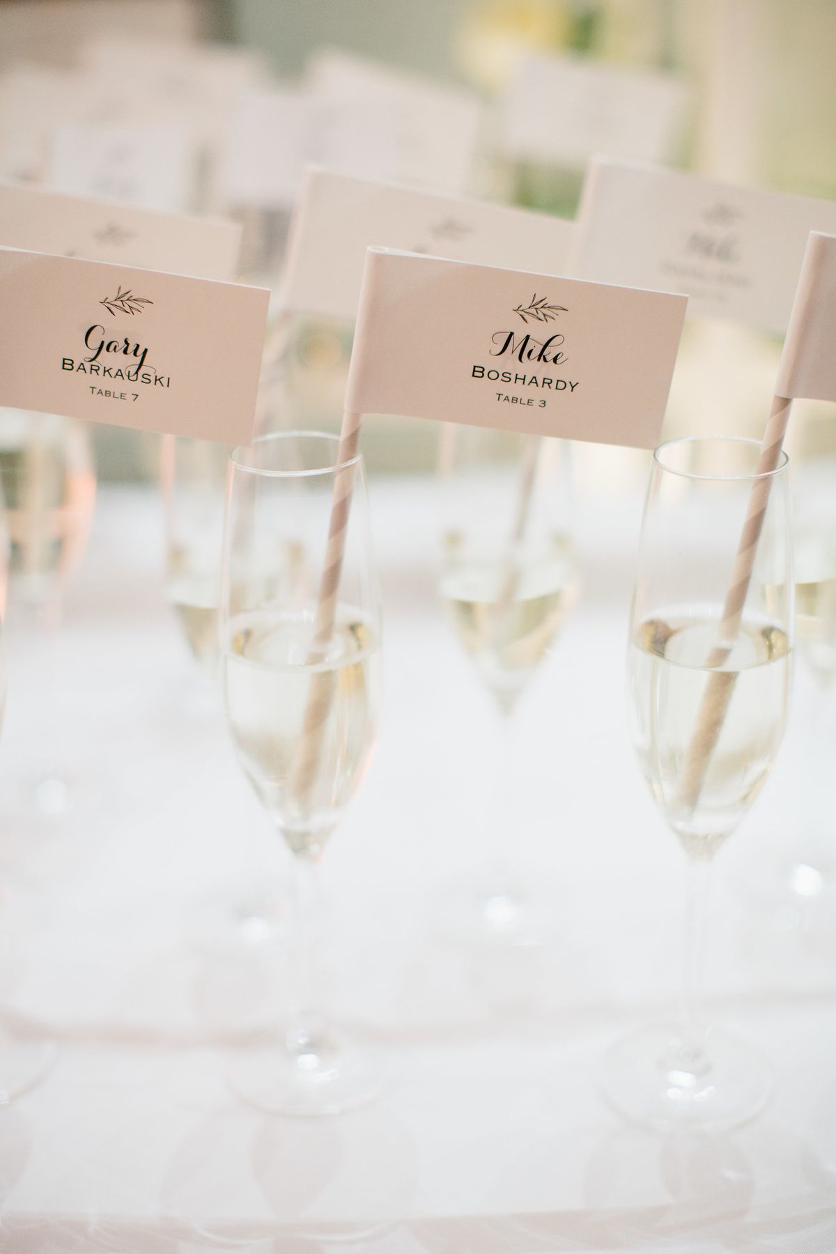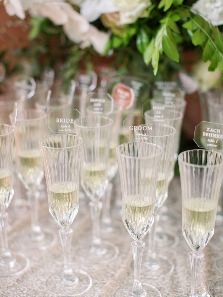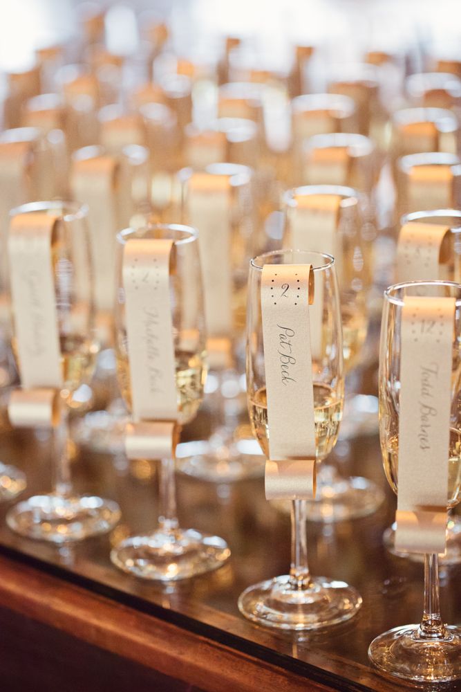 ゲストの名前とテーブルナンバーを書いた紙をグラスの縁に掛ければ完成。