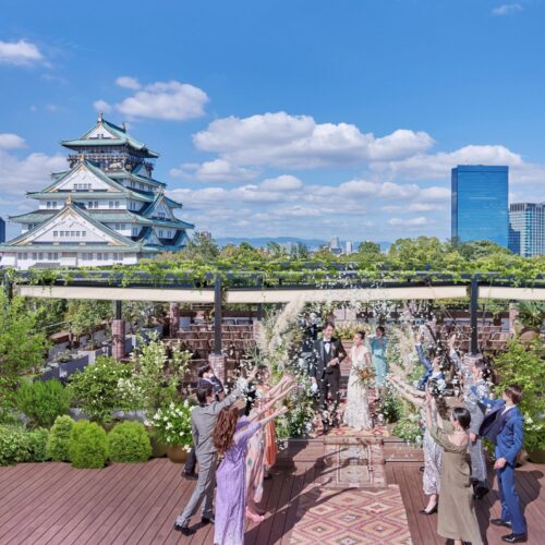 大阪の中心地にありながらも、大阪城・豊かな緑・青空と絶景のロケーションの中、非日常の空間を演出します 感動のセレモニーのあとは、自然溢れる豊かな緑の中のWelcome Partyで、ゲストの方々との特別なときをおすごし下さい