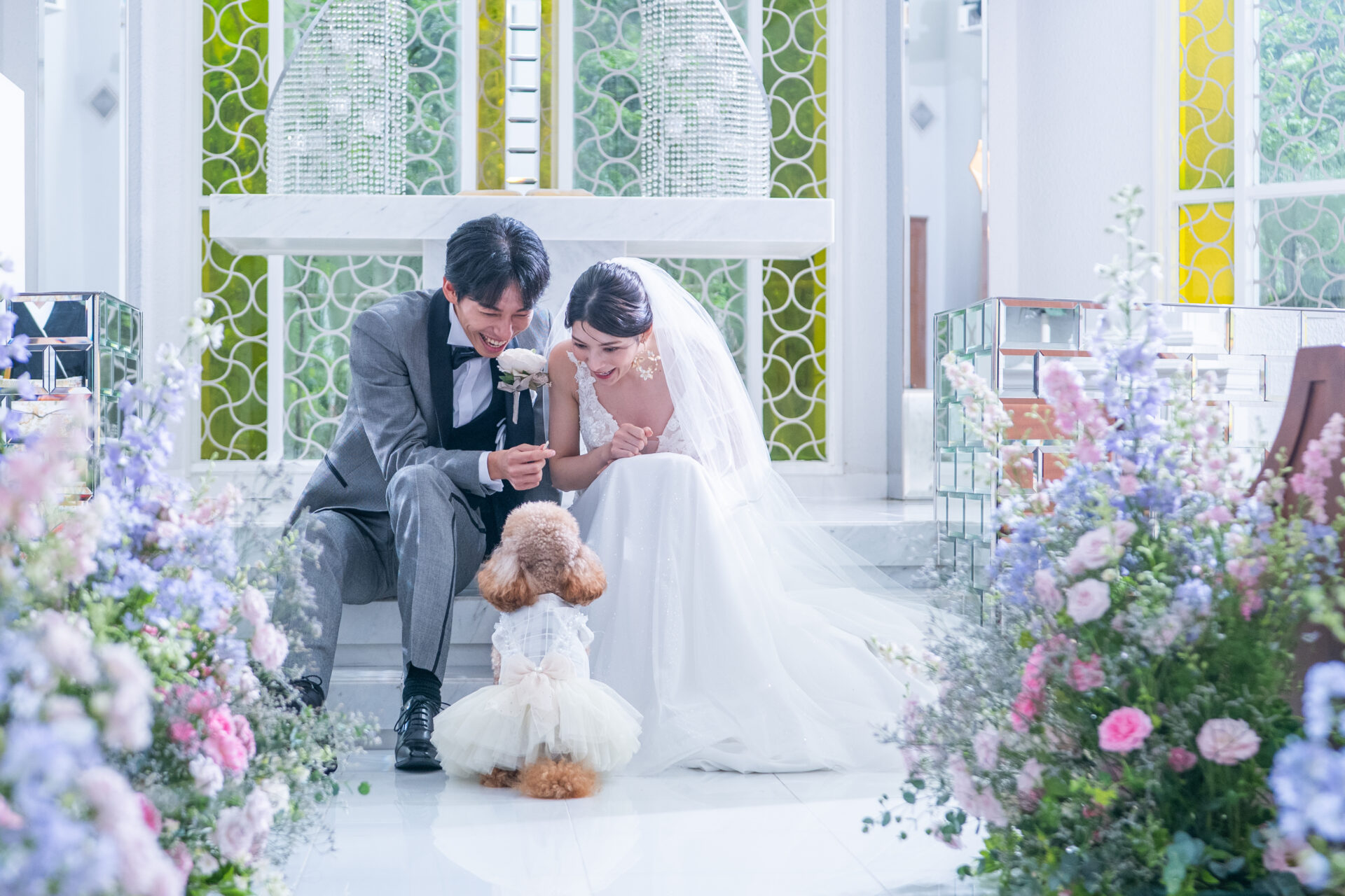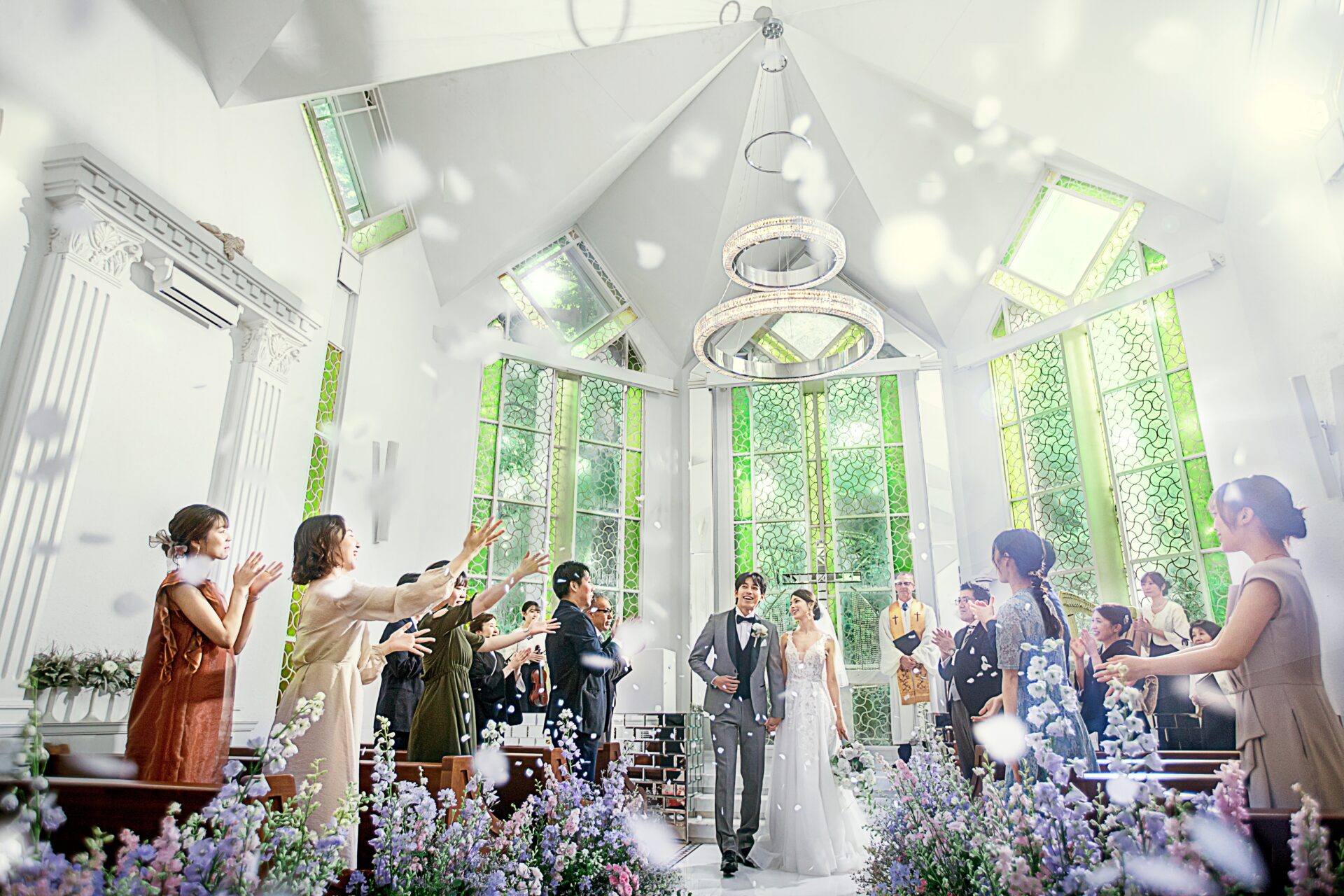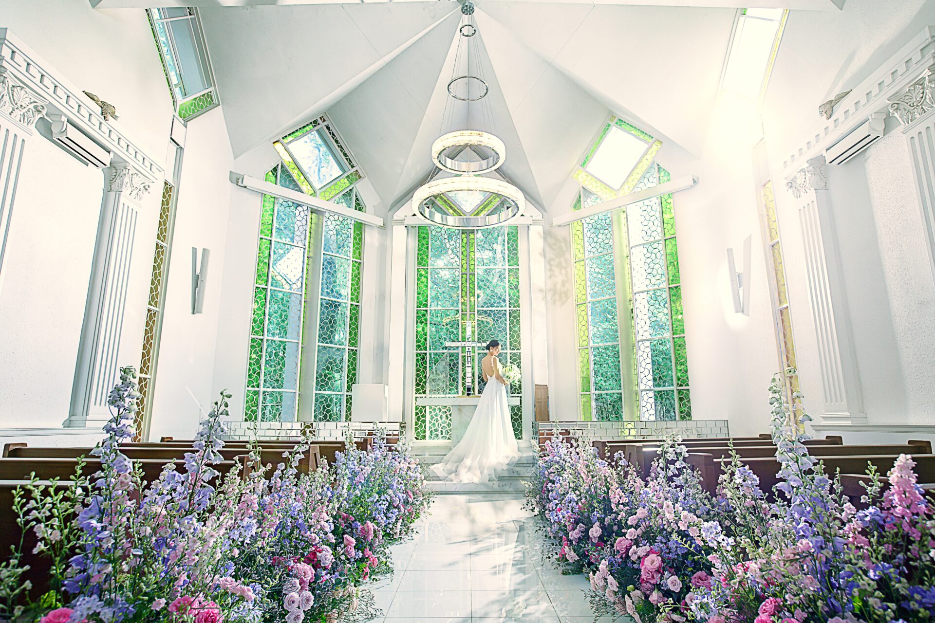 柔らかな自然光とステンドグラスの煌きに包まれるチャペル内では