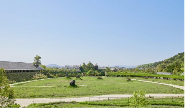 バームクーヘンで有名なクラブハリエとたねやのメイン施設。「丘」という意味のラ コリーナは、敷地いっぱいに広がる緑と複数のユニークな形の建物で構成されています。