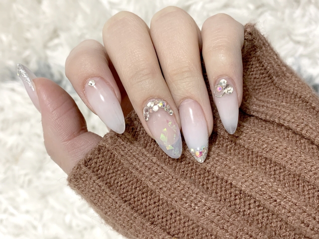 シアー感のあるホワイトグラデーションに、ホログラムやストーンを置いたネイルです。