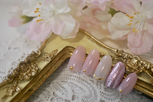 薄いピンクをベースとし、ワンポイントにラメが入ってます。
