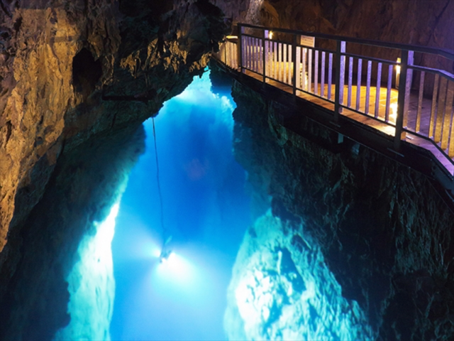 巨大な地底湖の深さは見る人を釘付けにし、吸い込まれそうな「青」の迫力は圧巻です。ライトアップもされているため、神秘的な世界にデートムードも高まりますよ。