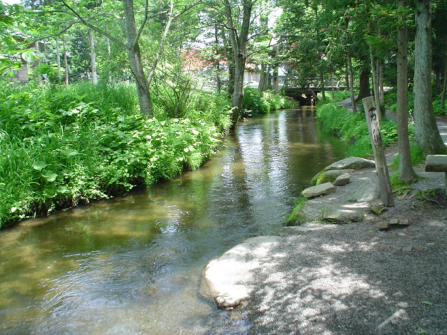 遠野市の田園風景の中にあり、のどかな景色の中に小川が流れています。
