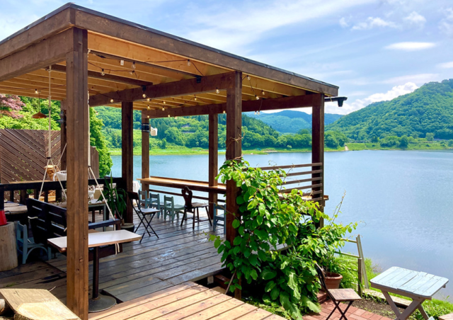 錦秋湖の湖畔にある、レイクビューが望めるオシャレなカフェ。