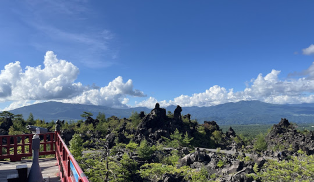 浅間山の天明大噴火による溶岩流が冷え固まってできた景勝地。溶岩が一帯に広がった壮大な景色が広がっています。
