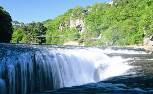 吹割の滝は「東洋のナイアガラ」とも称され、上から見下ろすタイプの横に長い珍しい滝です。