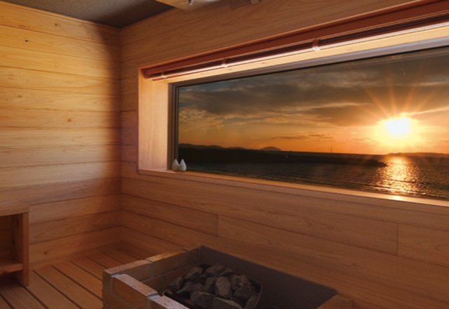 部屋からは福間海岸を一望することができ、サウナ室では座りながら水平線を見れるよう設計されています。