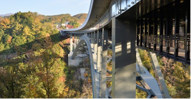 眼下には天竜川が作りだす荒々しい峡谷の様子や飯田線の電車が通る様子を見ることができます。特に秋は周囲の山々の紅葉が美しくおすすめですよ。