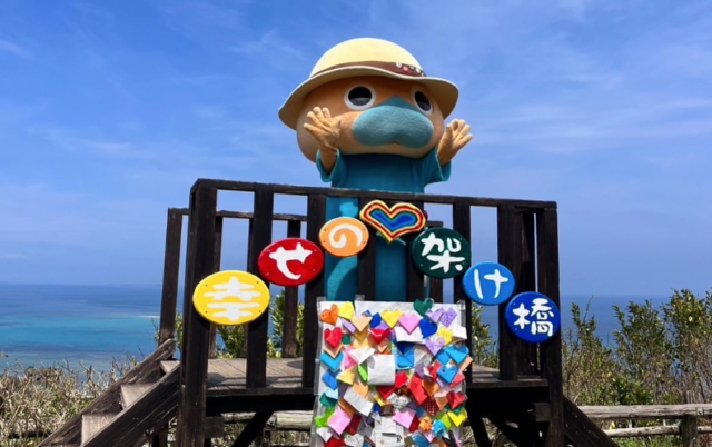 この橋が置かれている場所は、沖縄の聖域「久高島」と世界遺産「斎場御嶽」の中間地点となっていることから、橋の上で手を広げると幸福が訪れると言われています。