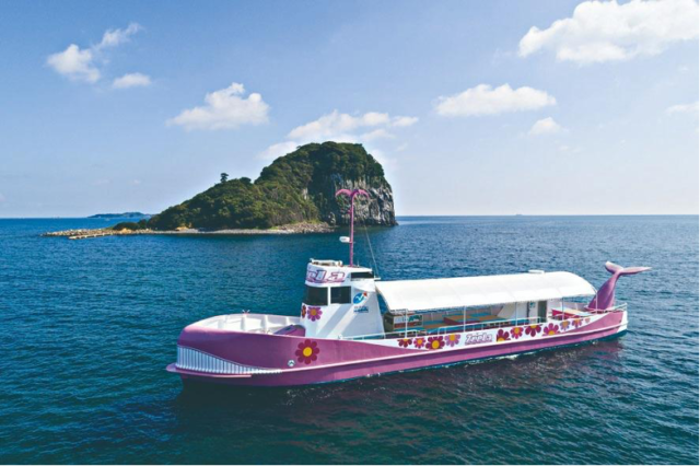 クジラ型の可愛い形の船で海面下1.2mの魚や海の生き物を観察できます。