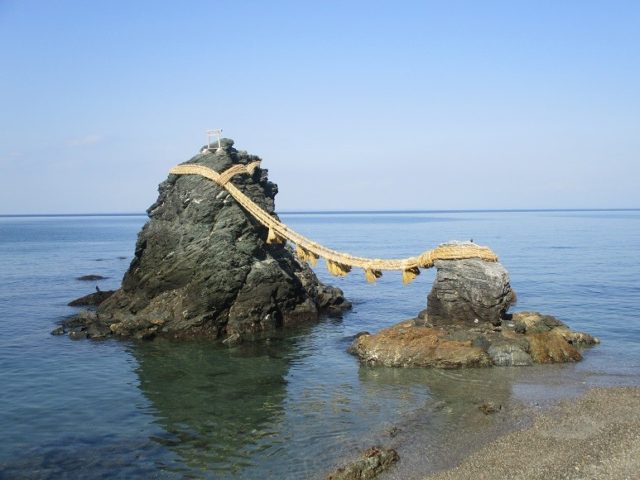正面の海に見える大注連縄で結ばれた夫婦岩は、「縁結び」や「夫婦円満」のパワースポットとして人気を集めています。