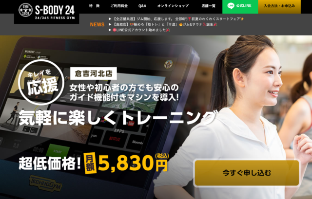 S-BODY24は、鳥取県内に2店舗展開している年中無休・24時間営業のフィットネスジムです。