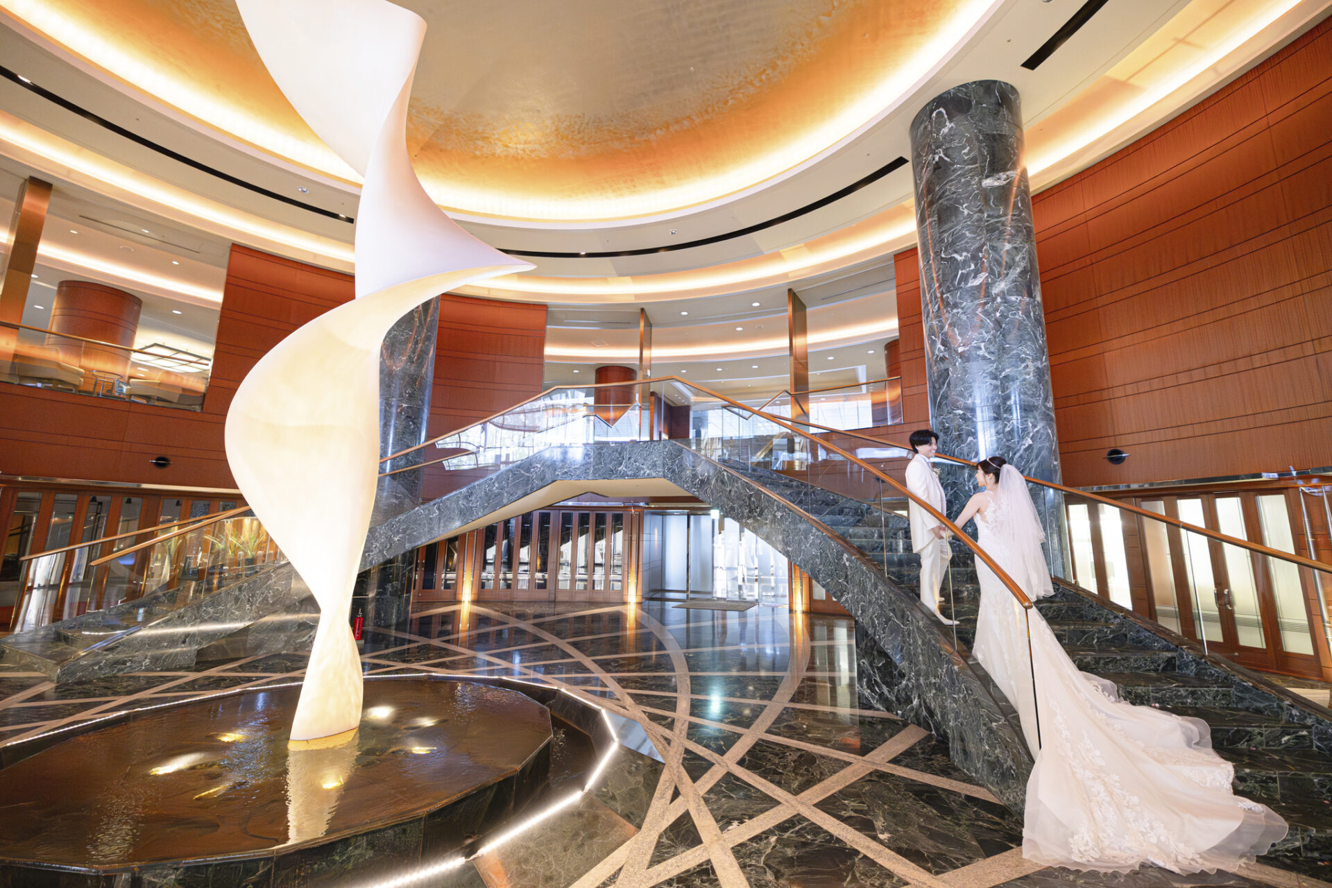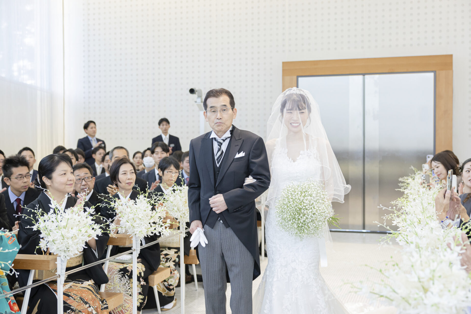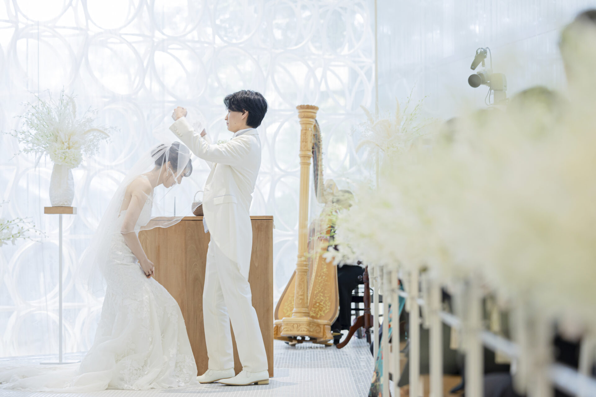 お二人が大好きな幾重にも重なる輪が背景を彩るチャペル。